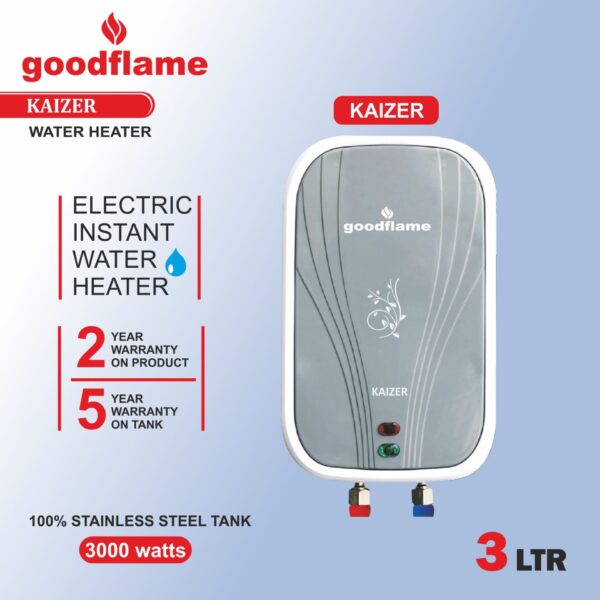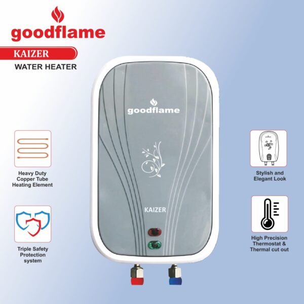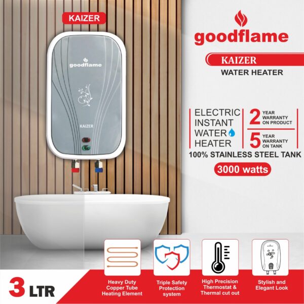 You can get hot water in no time with the help of the goodflame Kaizer Grey 3 L Instant Water Heater. Its rust-resistant, strong, and high-quality engineered polymer construction ensures enduring performance. Additionally, the superior finish of its outer body ensures that this water heater keeps looking good even after extended use. Moreover, this water heater has LED indicators, which turn red when turned on and turn green when the heating is activated.